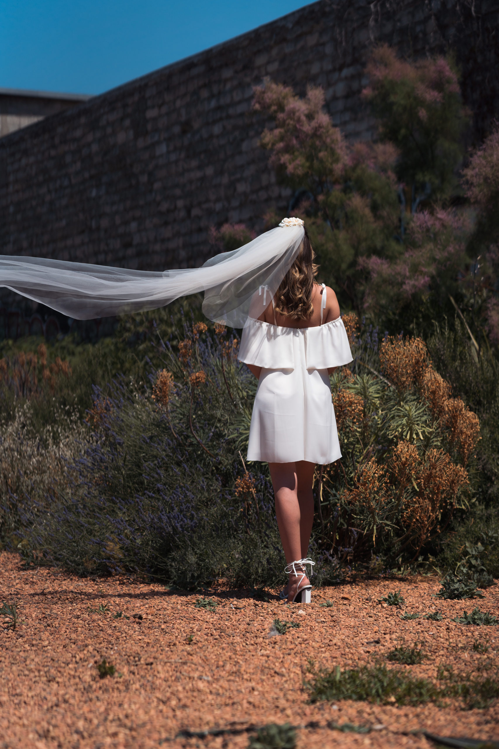 Amaia est moderne, elle reste romantique avec ses rubans à nouer en guise de bretelle. Sa demie cape lui donne un charme et la rend plus chic