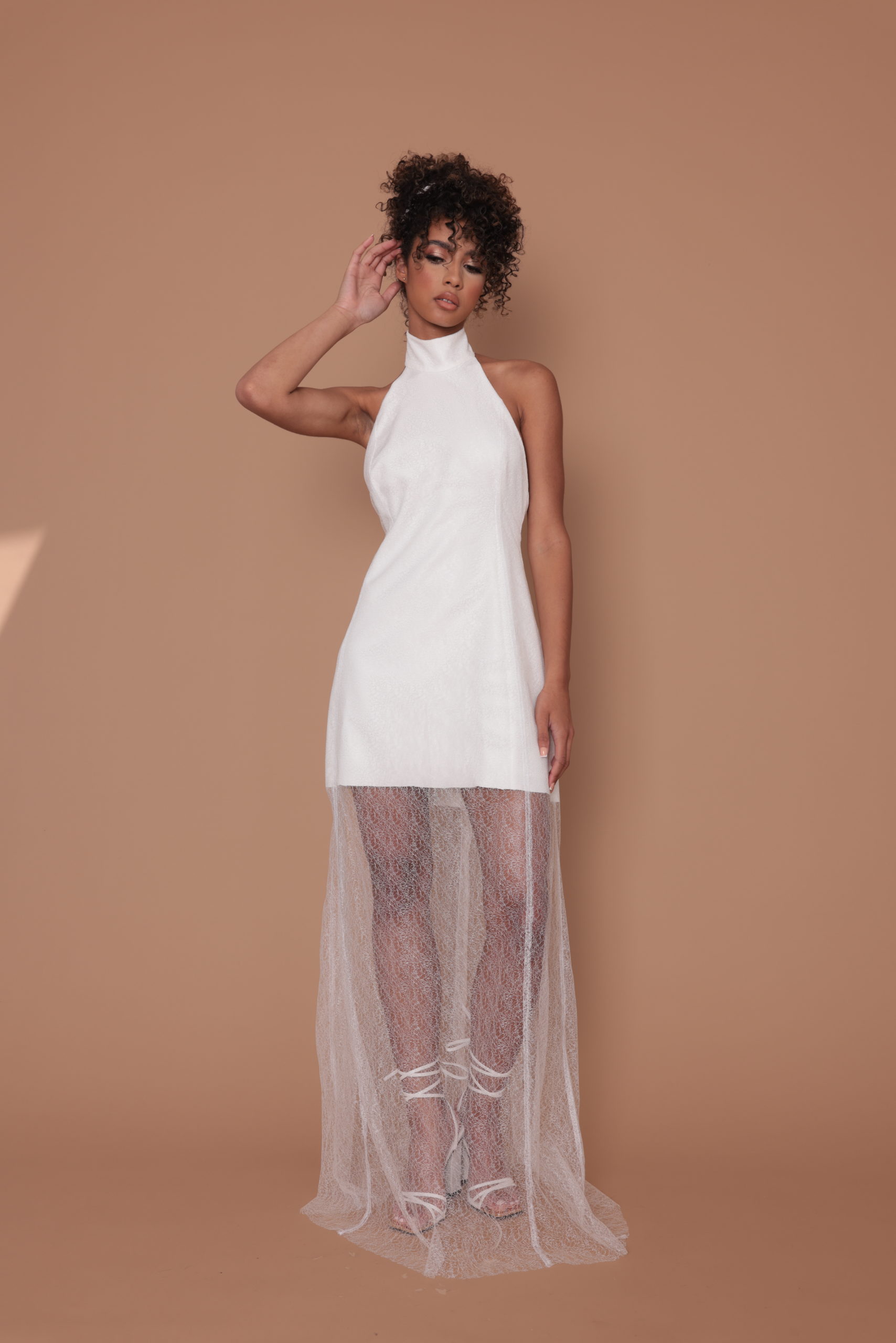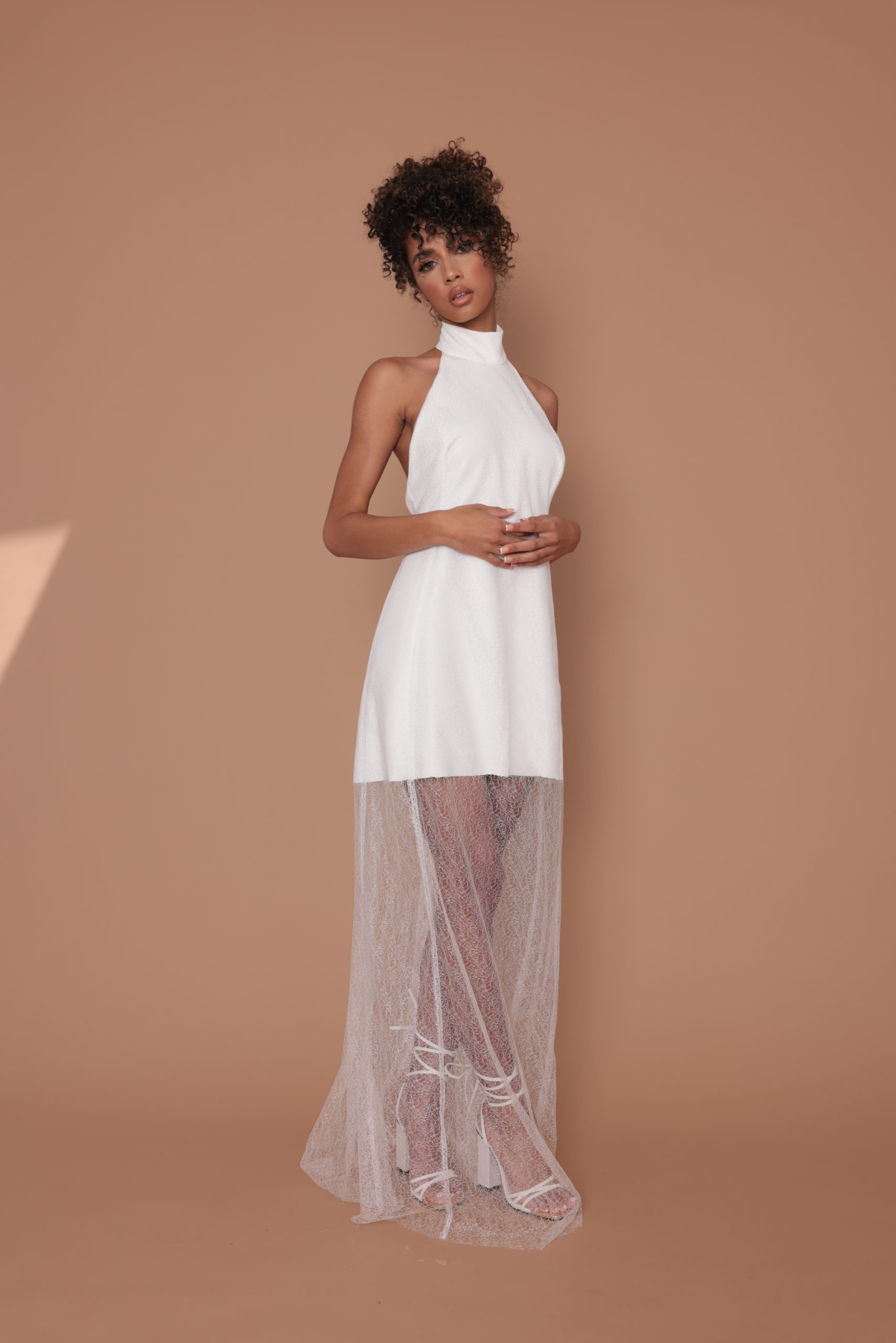 Robe longue Angie. Robe pour le civil ou votre cérémonie, Angie joue le jeu de la transparence avec deux couches de tissus donc une de tulle brodée. Col montant pour la touche raffinée.
