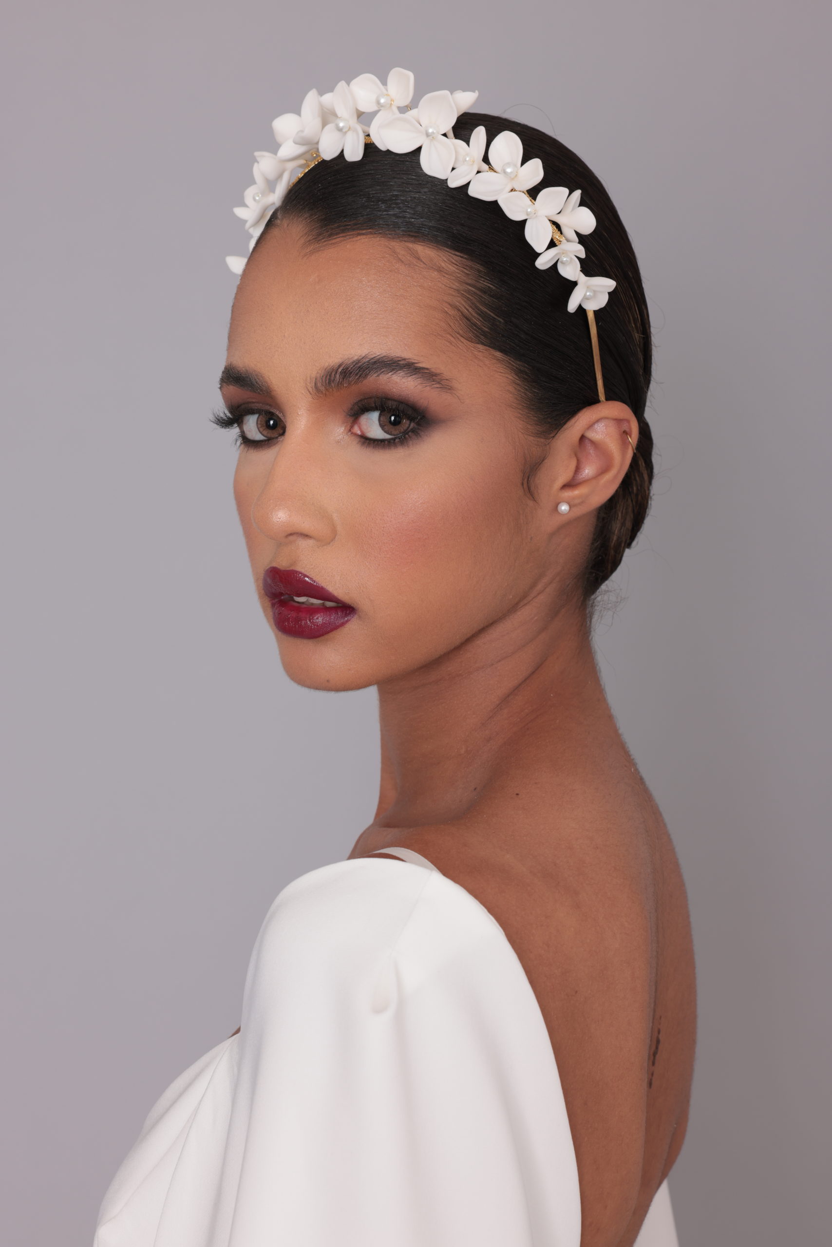 Bijou de tête Emma notre serre-tête pour coiffure de mariée réalisé à la main. Emma est confectionné en porcelaine froide et orné de perle synthétique.