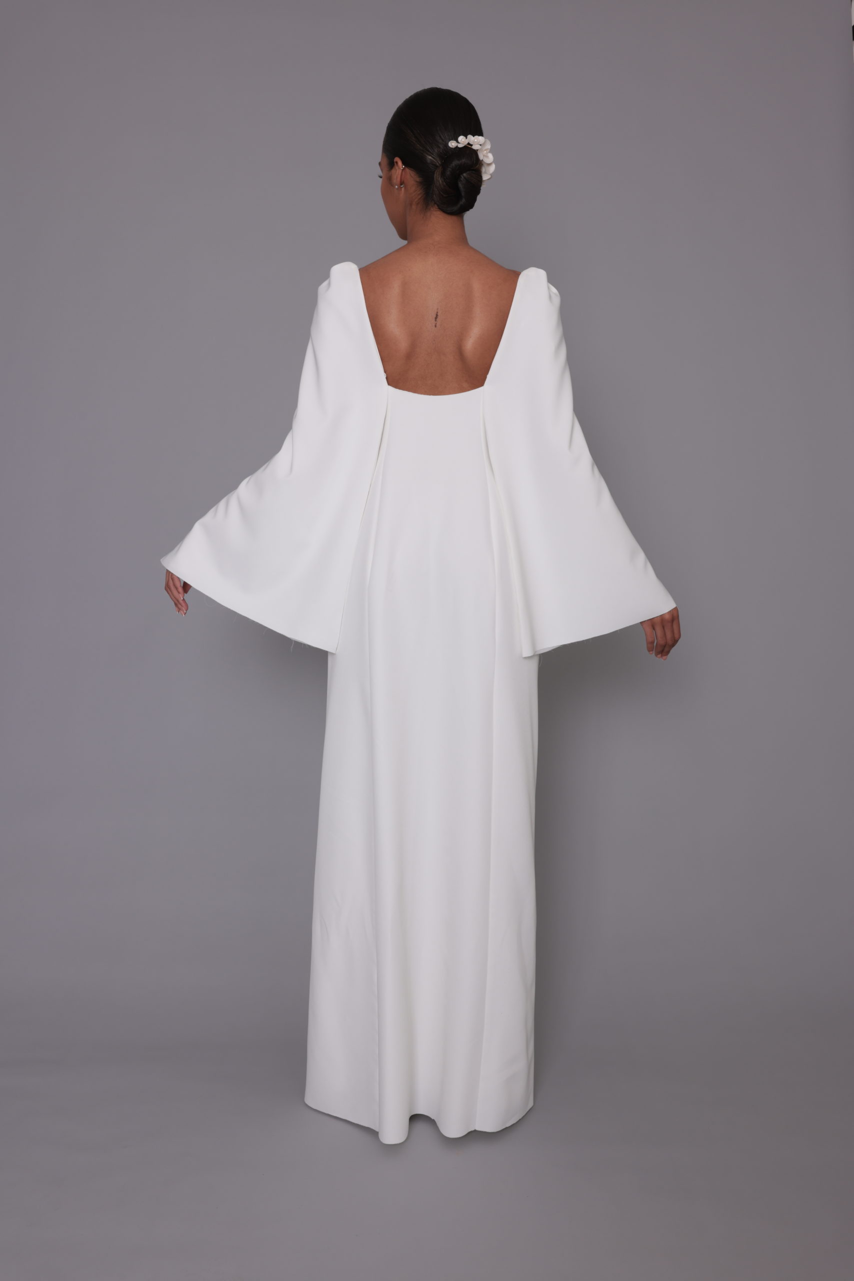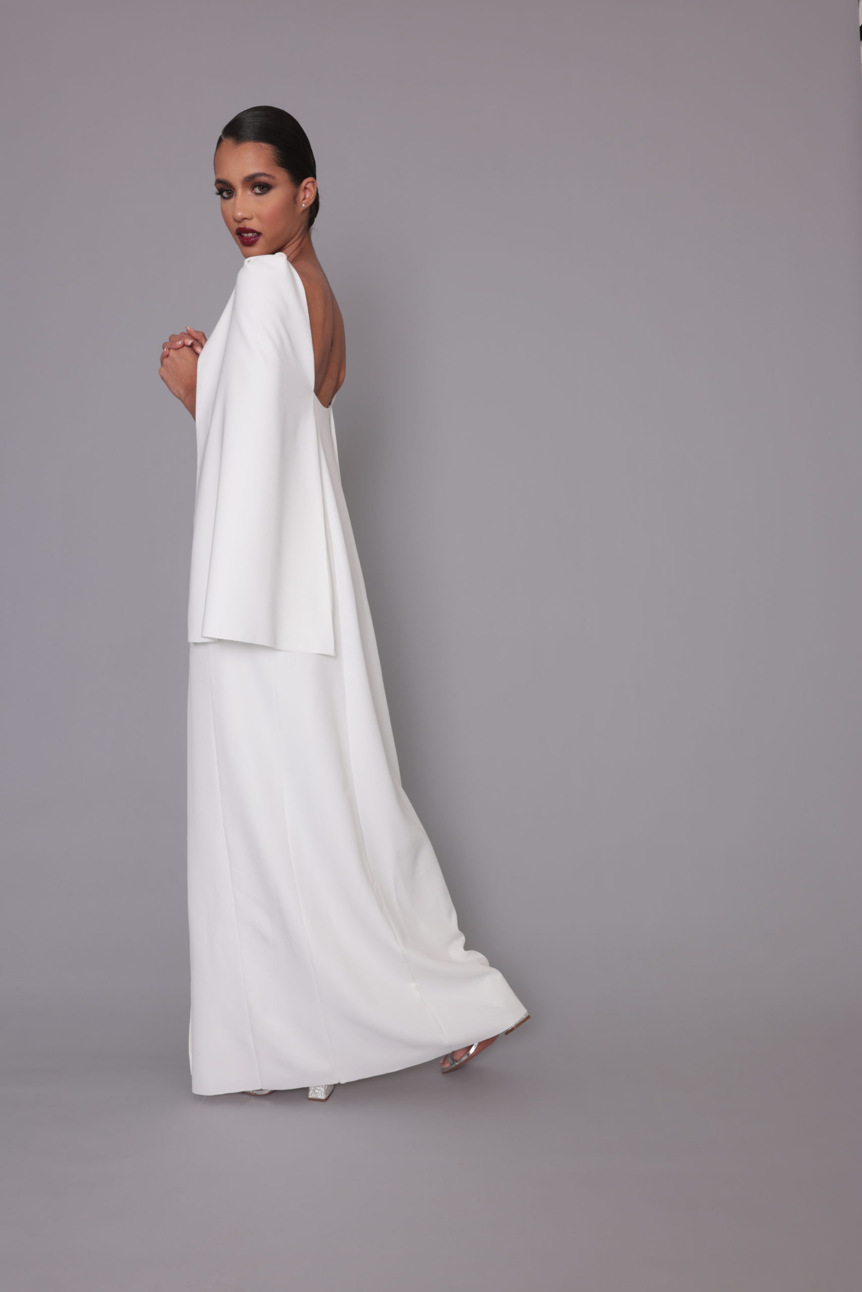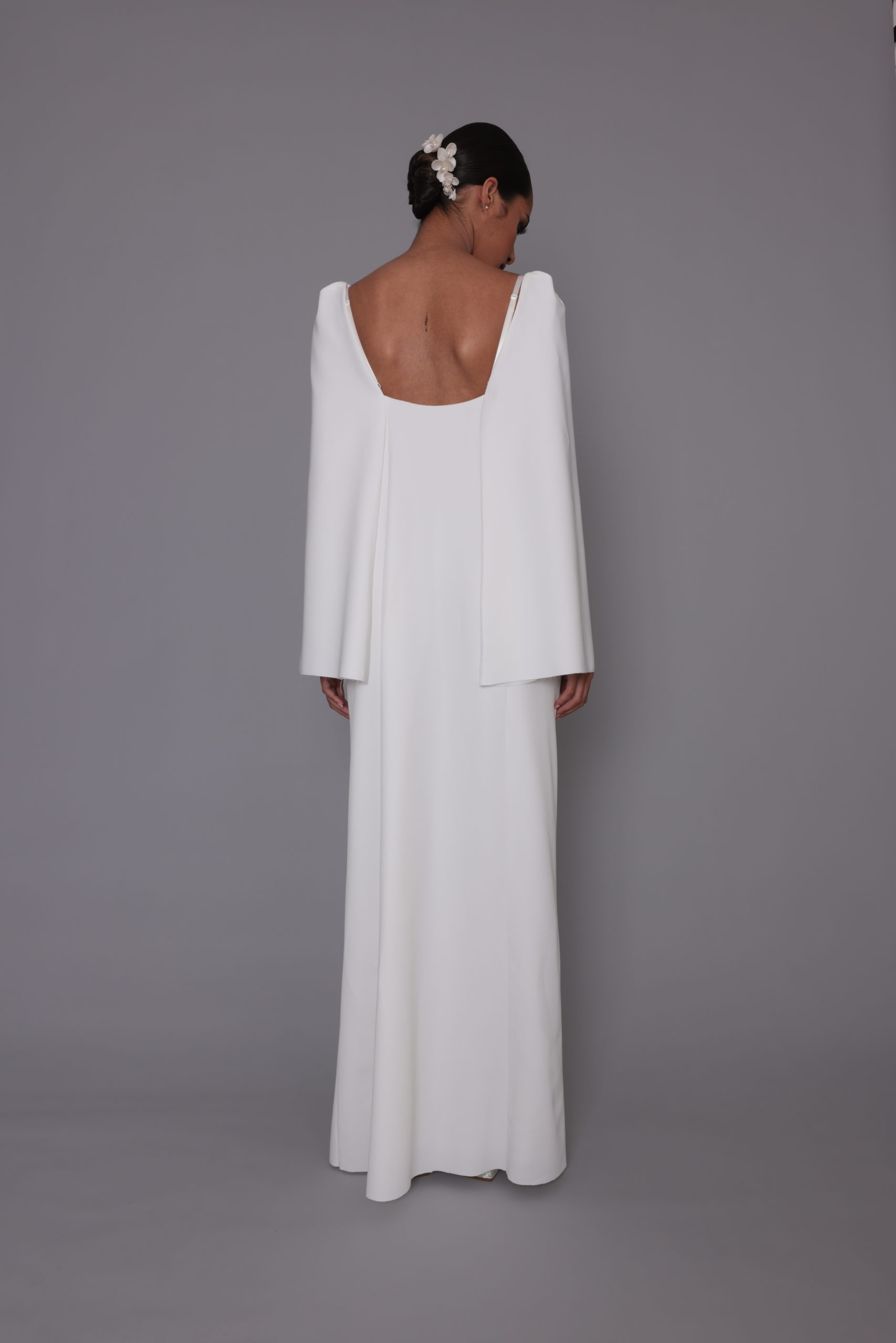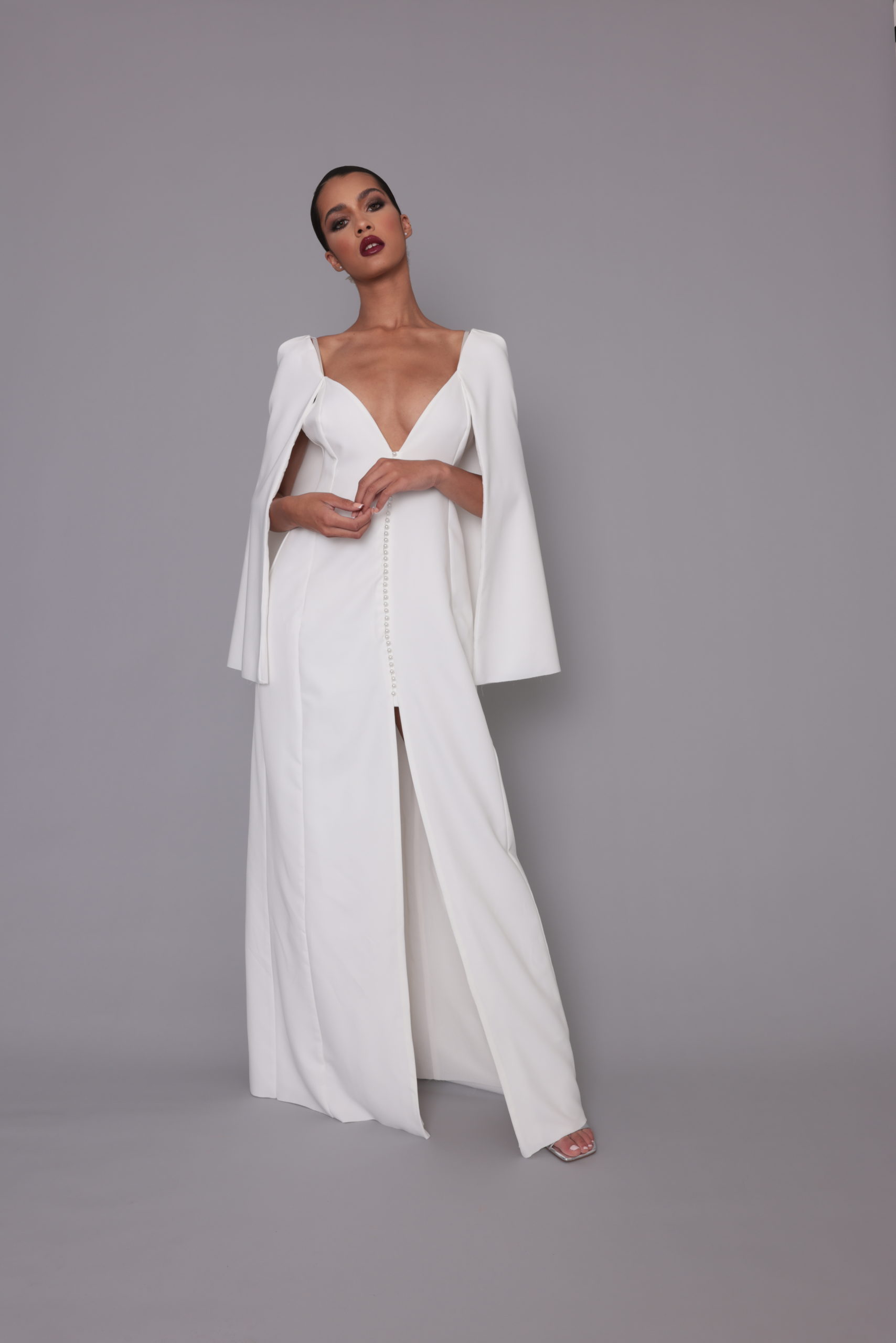 Robe longue Loma, décolleté devant ouvert, Loma sait aussi être discrète et raffinée avec sa demie cape. L’ouverture de cette robe se fait sur le devant avec son boutonnage perlé