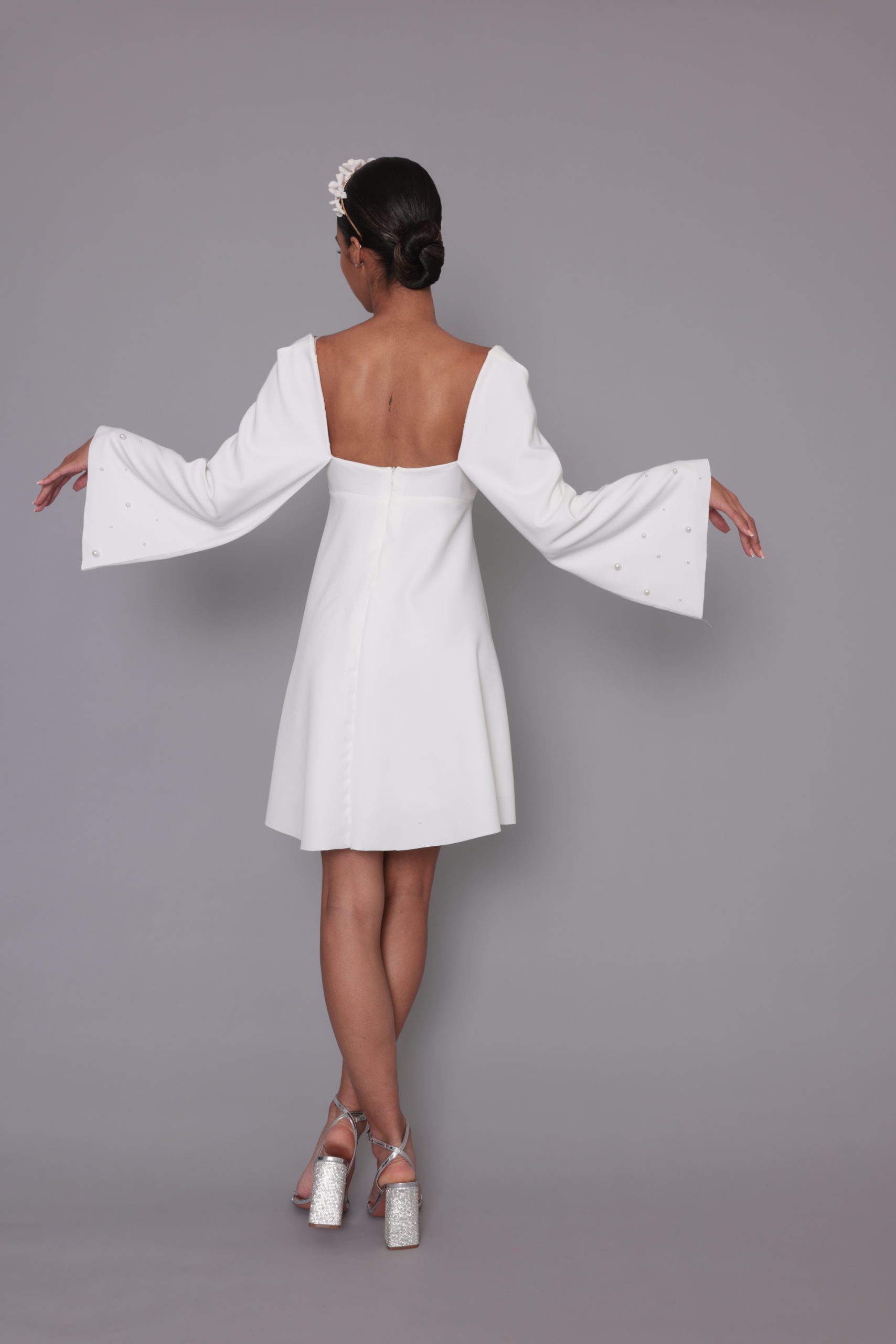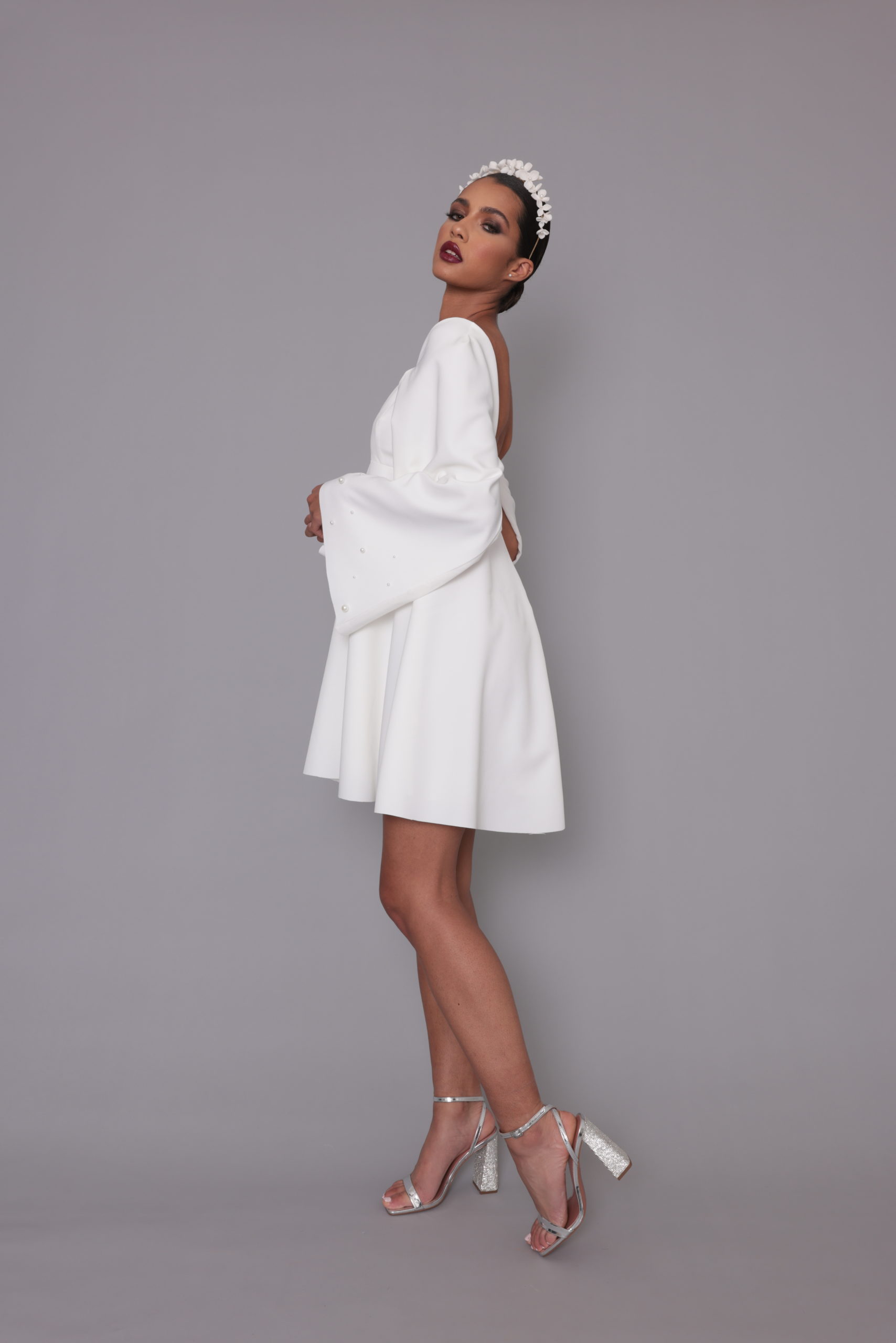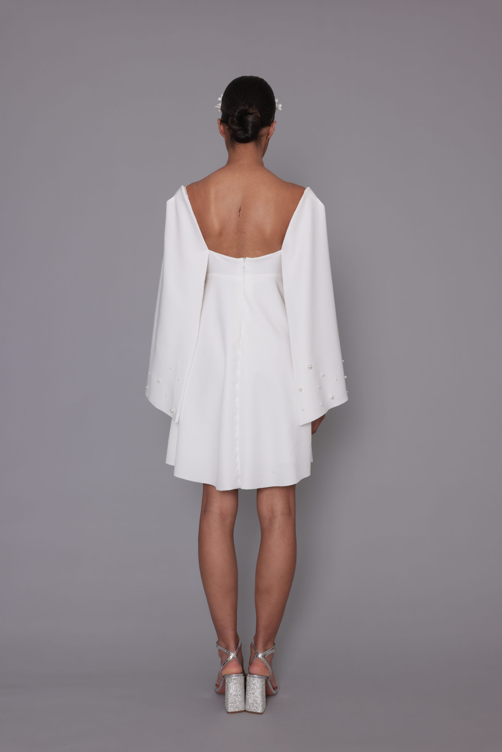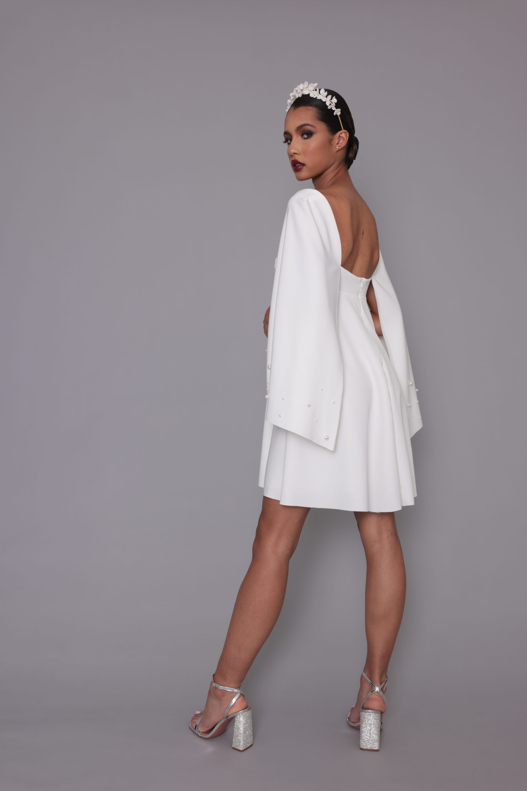 Robe courte, Luca coupe empire sous poitrine, un décolleté en coeur et la fameuse demie cape et pour le petit détail les bas de capes sont habillés de perles