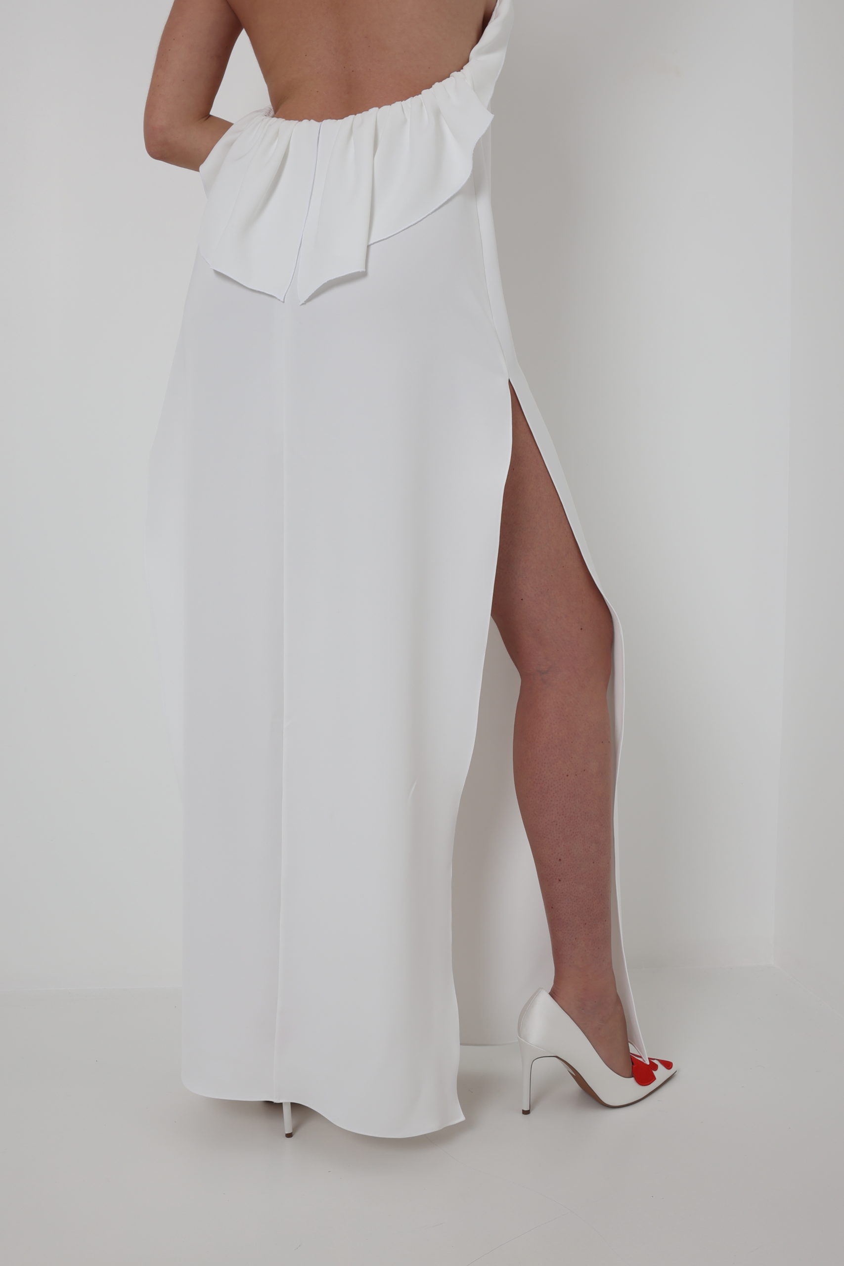 Pour cette nouvelle collection on à voulu une robe longue avec du détails, on vous offre ces volants qui viennent casser le côté “too clean” de cette robe. Ces deux longues fentes sont la pour mettre vos jambes en valeurs, petite ou grandes vous serez misent en valeurs.