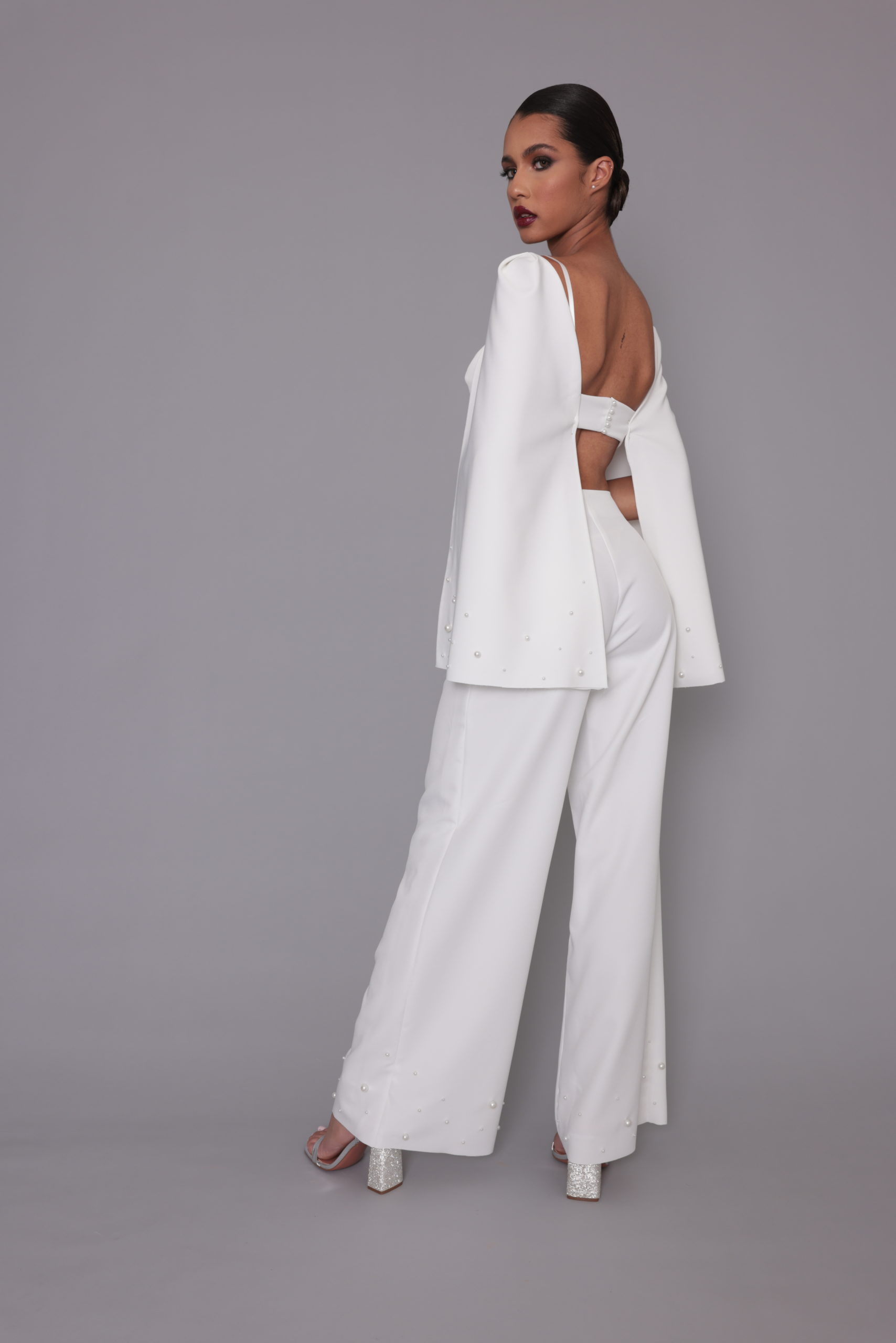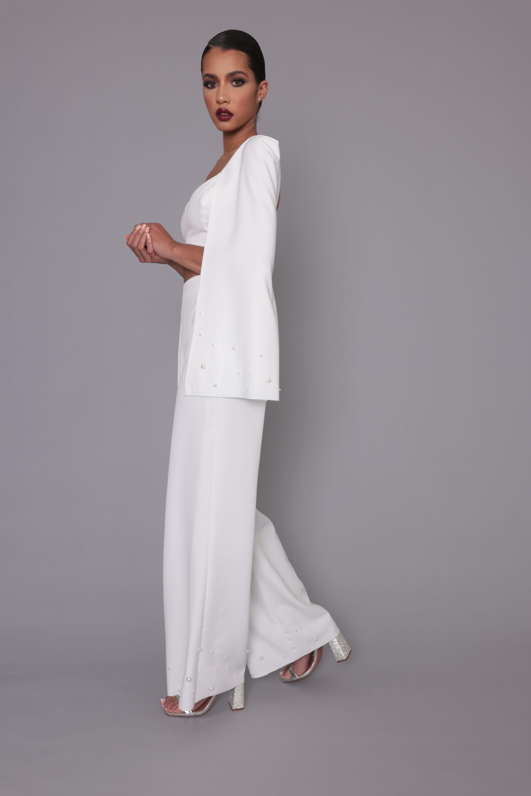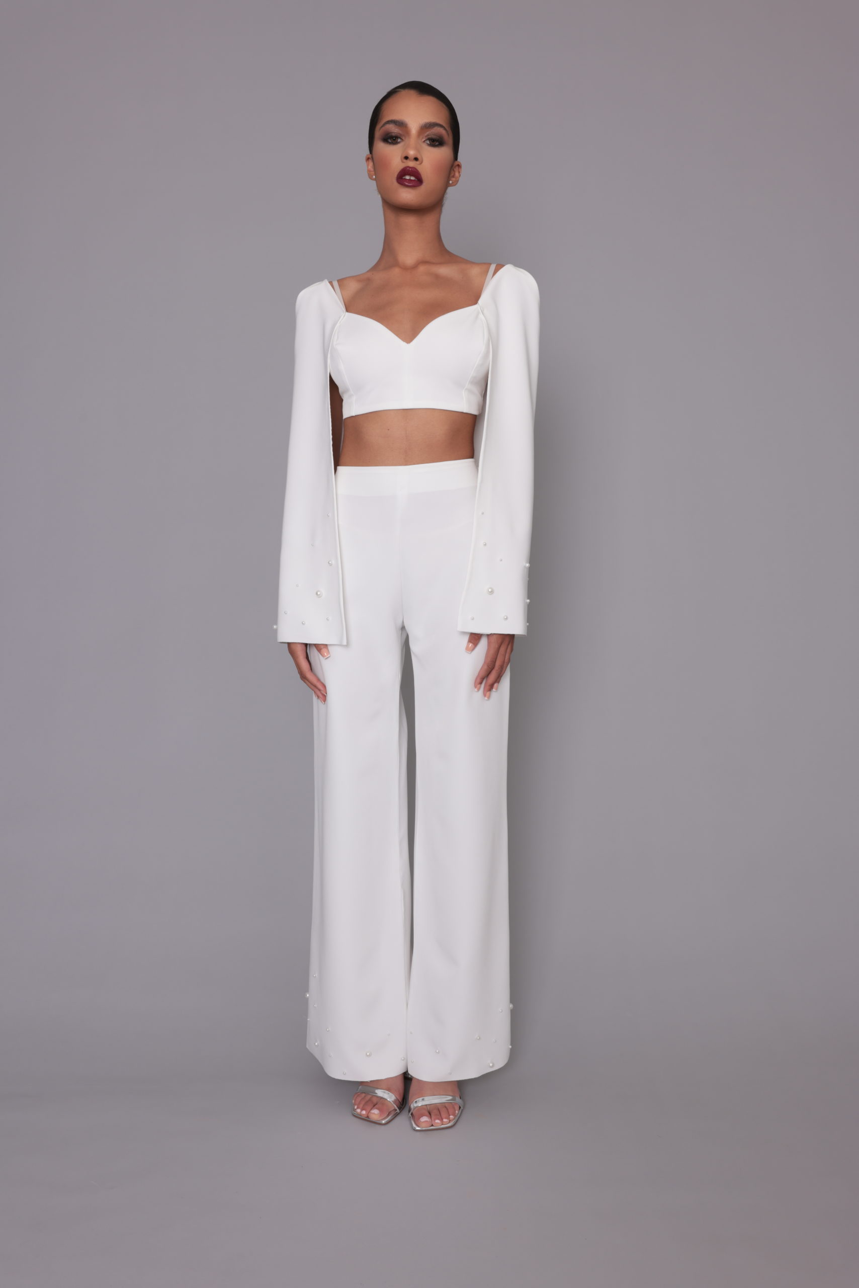 Costume deux pieces composé d’un haut avec demie cape et d’un pantalon avec bas de jambe perlé.